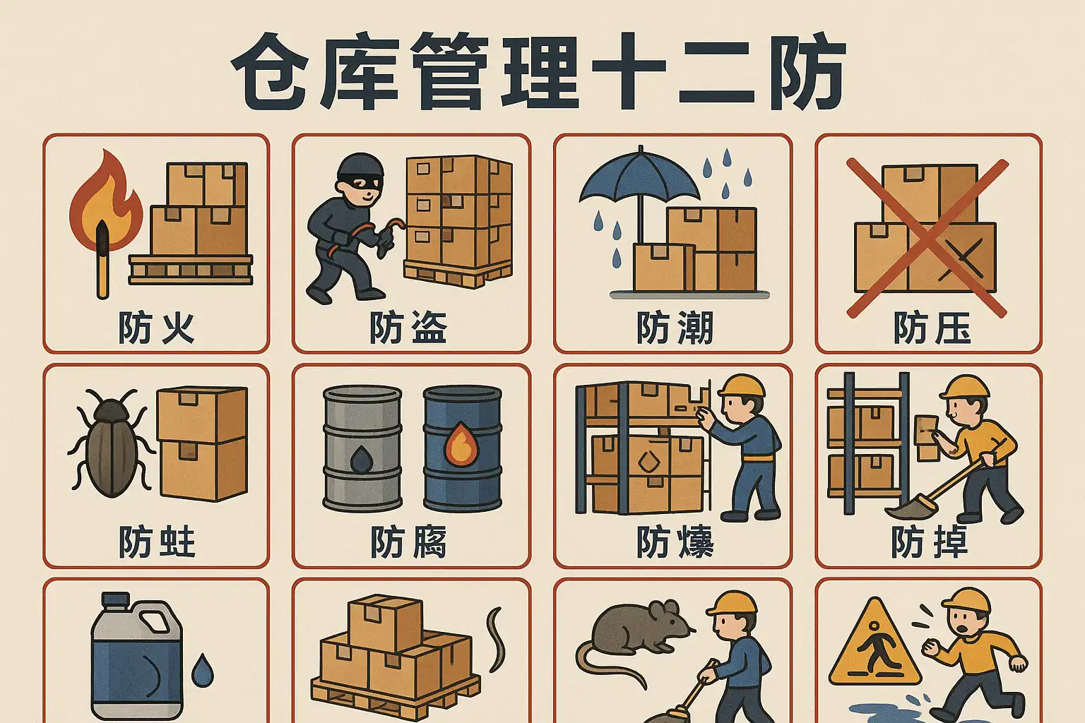 仓库管理“十二防”体系是现代仓储企业在长期运营实践中总结出的风险防控标准。其核心目的在于最大限度减少人为失误、环境影响和系统漏洞,保障库存安全与企业经济利益。