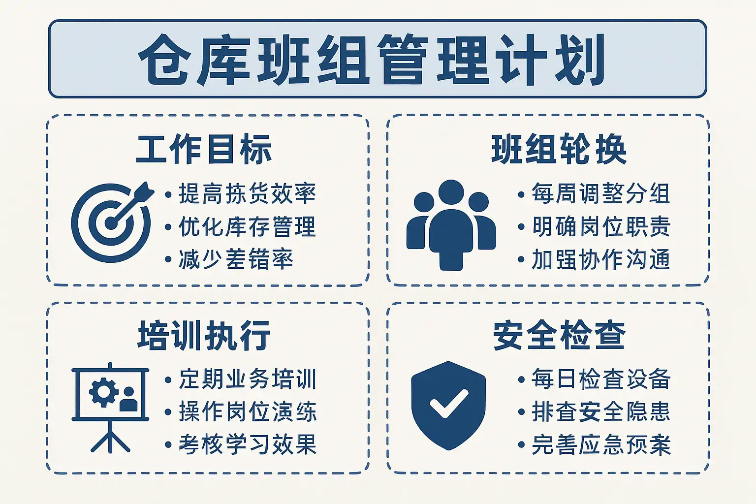 - 风险评估与安全管理:识别潜在风险,制定安全操作规范。 案例说明:某电商仓库通过明确每日订单处理目标,结合扫码技术,实现了拣货效率提升15%,差错率下降7%。 通过以上结构化步骤,仓库班组管理计划更加科学合理,提升整体管理效果。