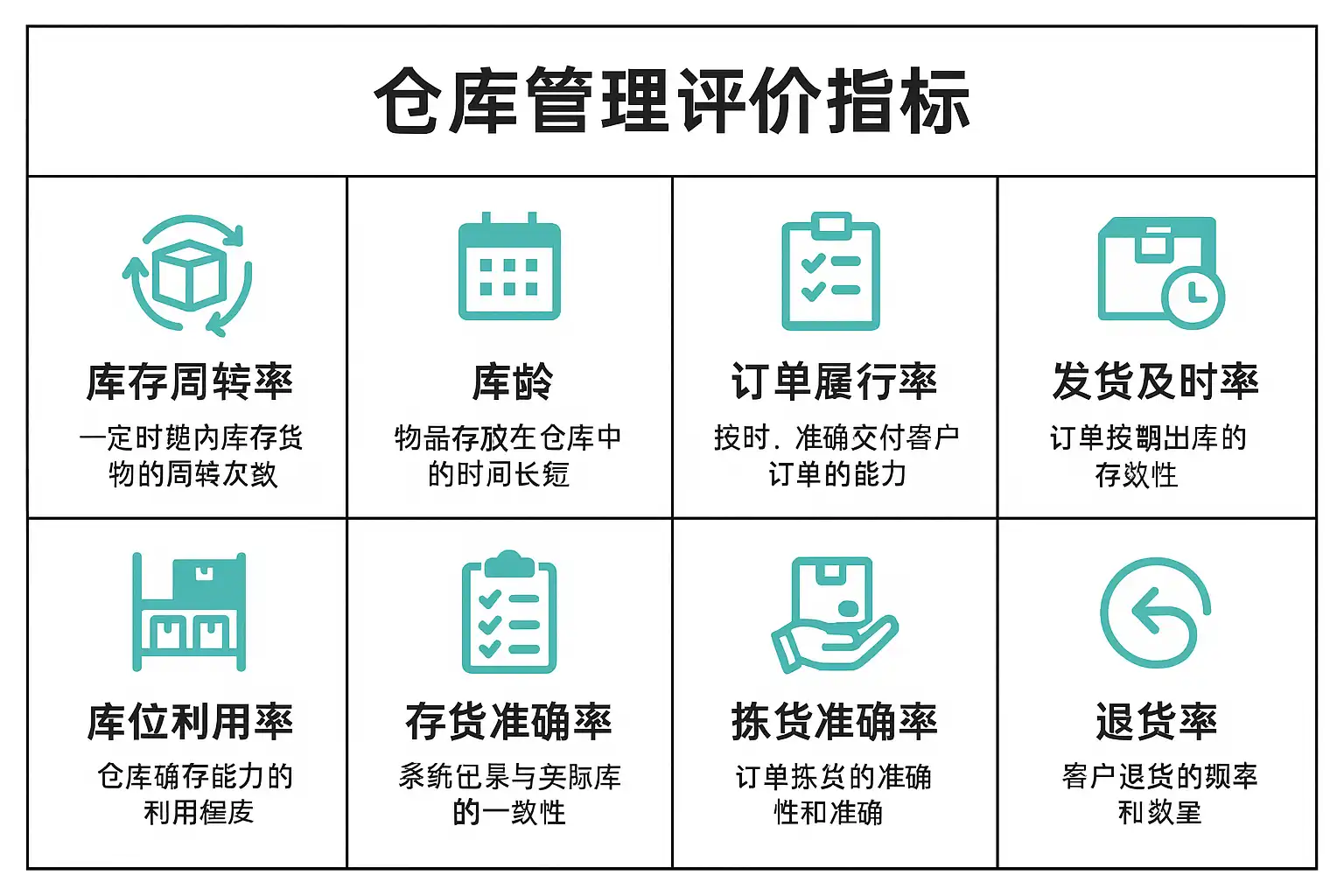 仓库管理评价指标是衡量仓库运营效率、服务质量和安全水平的重要工具。常见评价指标包括如下几个方面: