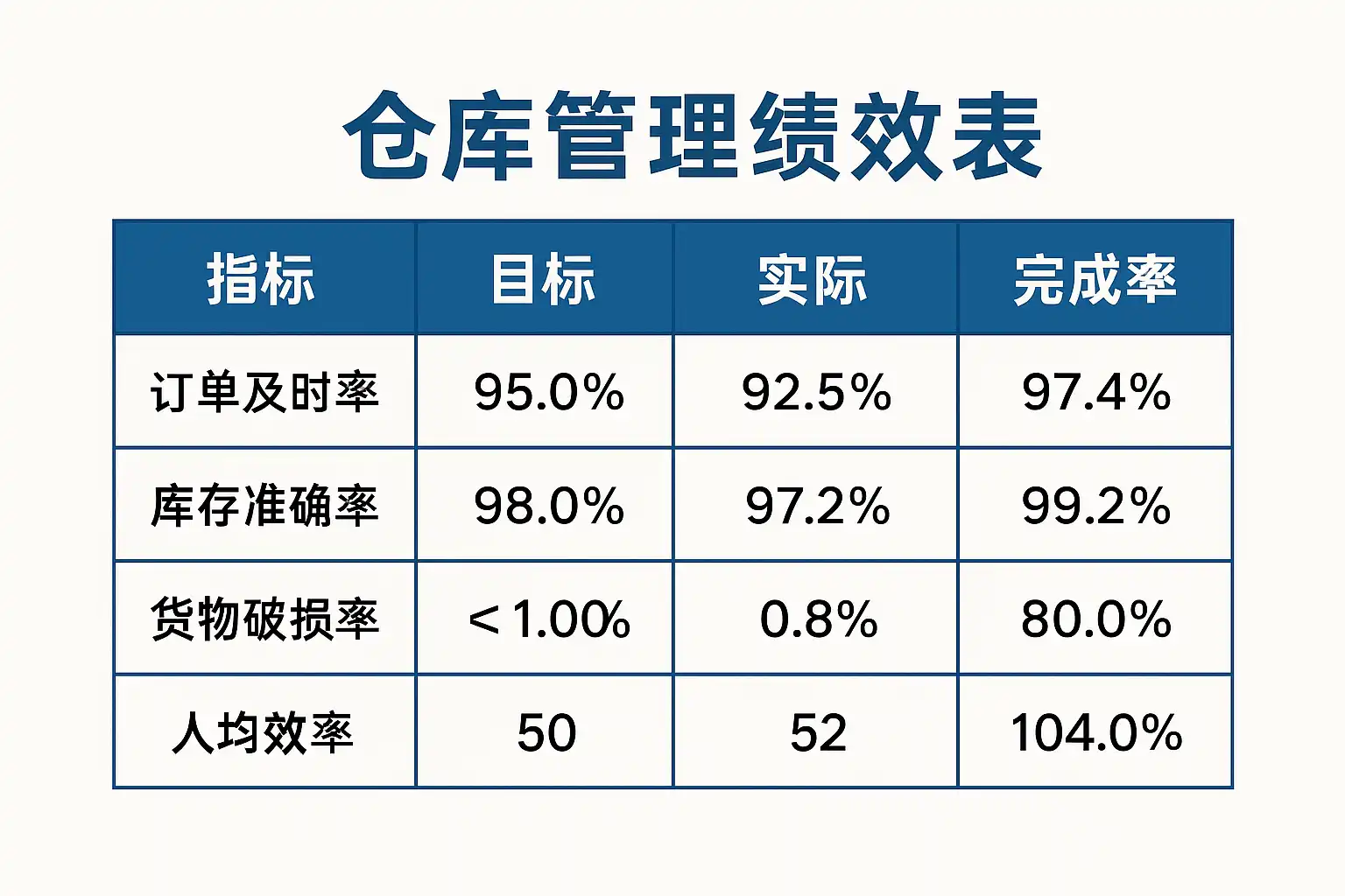 - 持续监控绩效表变化,验证改进效果 案例:某仓库通过绩效表发现拣货时间过长,调整货架布局后,拣货效率提升了25%,整体订单处理速度提升18%。