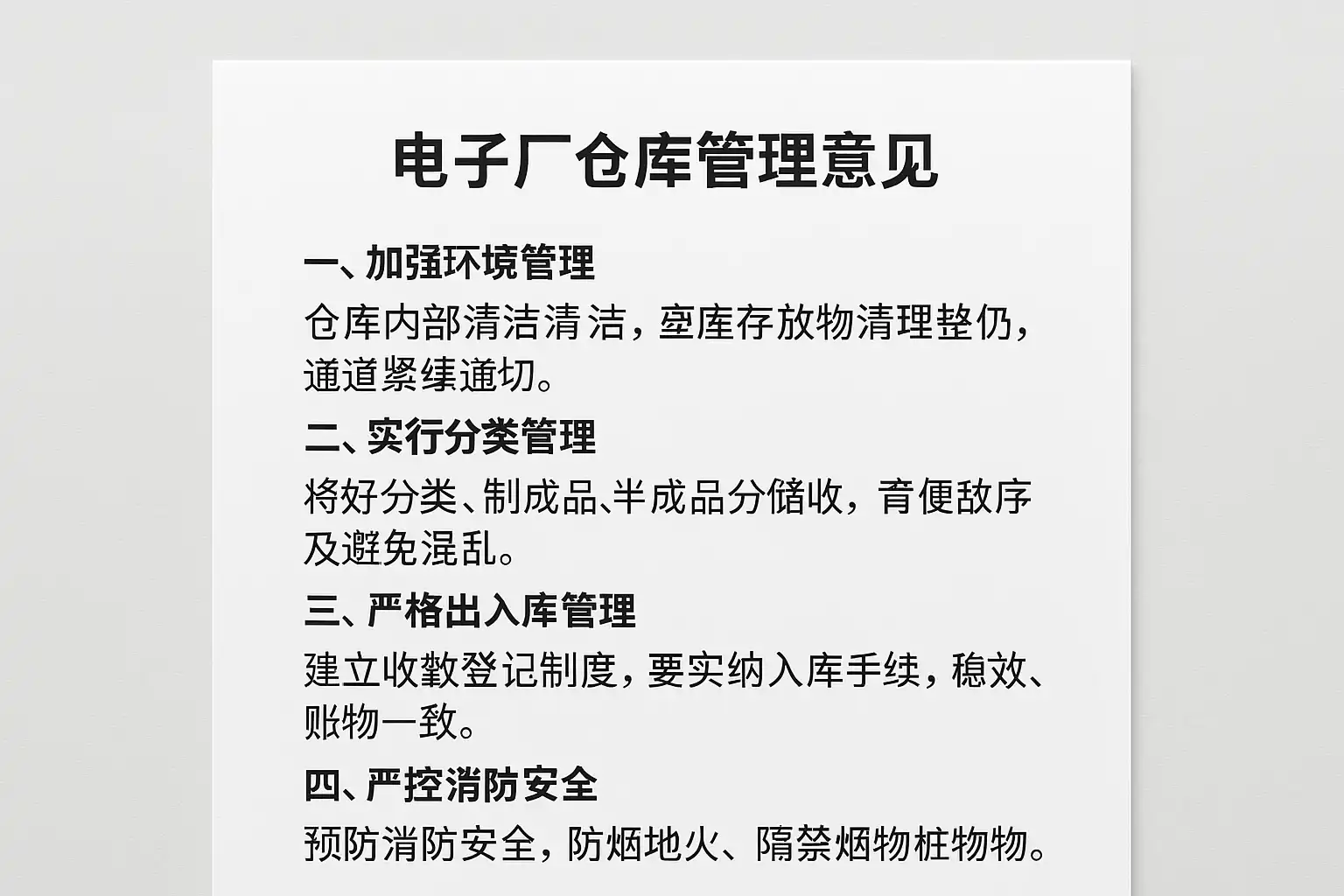 我在电子厂工作,负责仓库管理,但总感觉流程不够顺畅,不知道有哪些具体的管理意见可以帮助提升仓库的整体运行效率?
