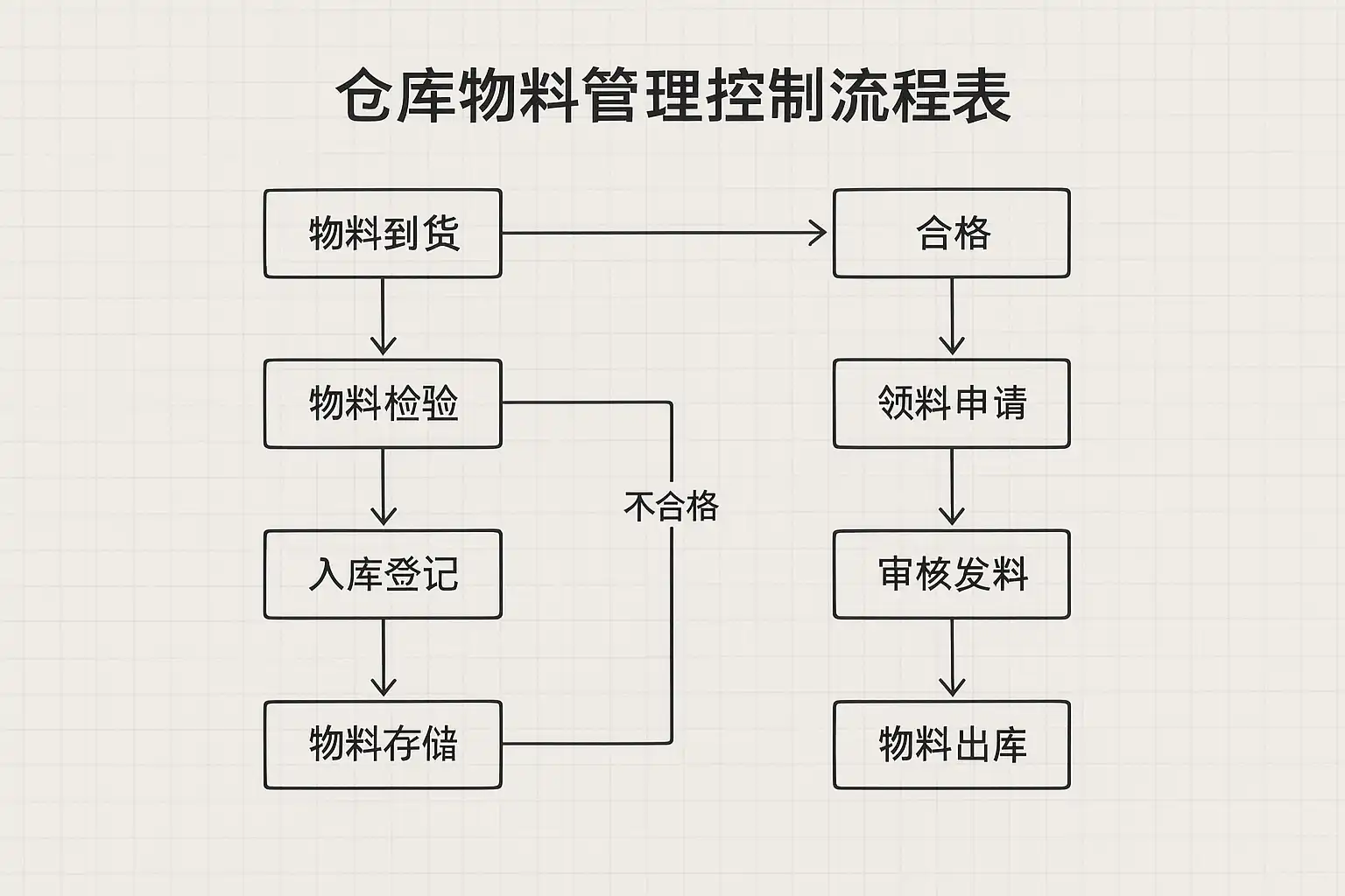 | 1. 物料入库 | 接收物料,核对数量和规格,登记入库 | 验收标准化、数据准确 |