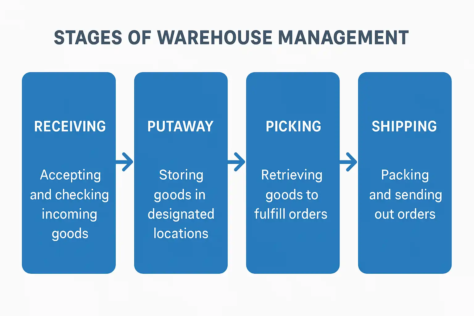 - 存储管理阶段 — 包括货物分类、合理布局和库存维护,提升仓库空间利用率。
