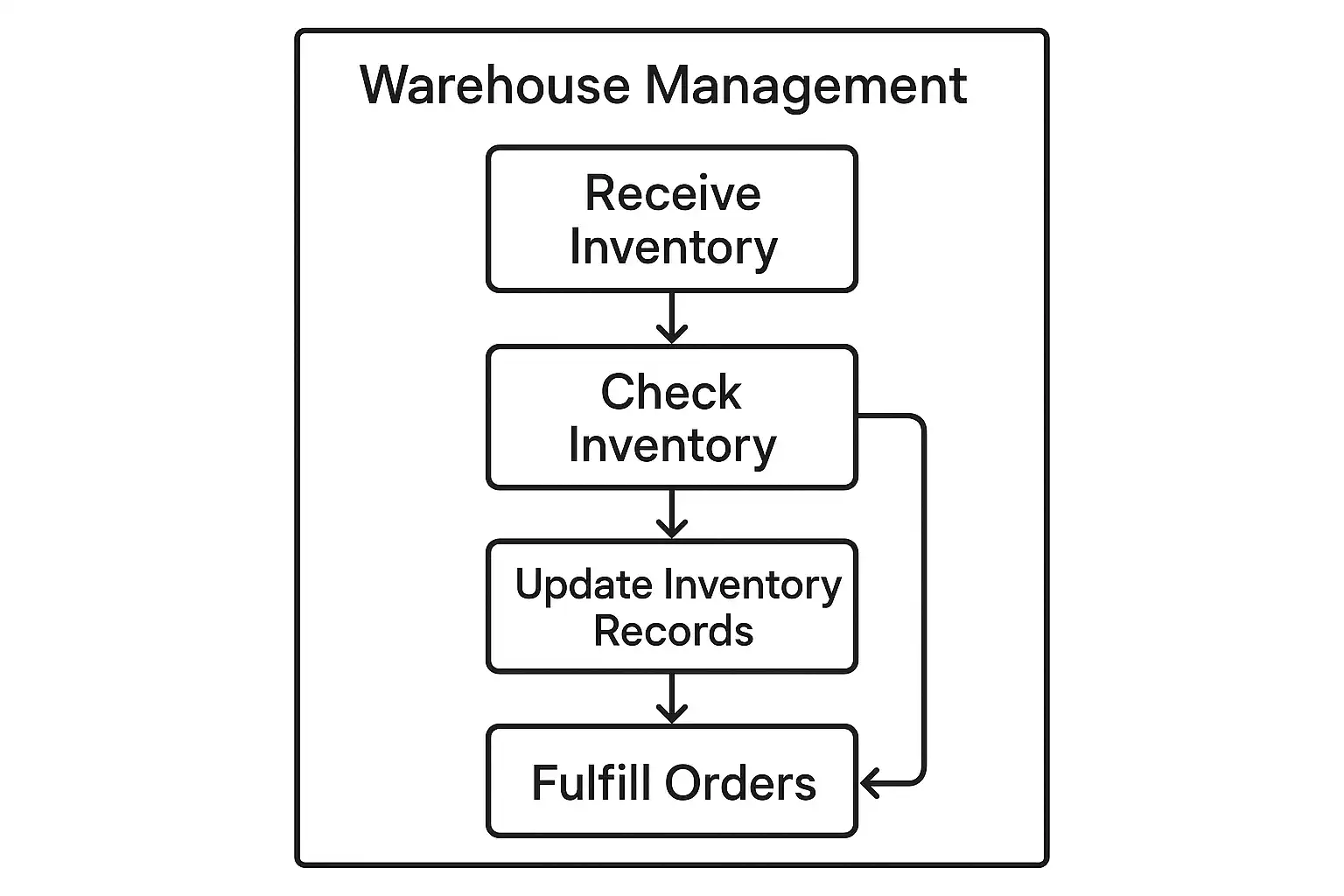 flowchart TDA[供应商发货] --> B[入库验收]B --> C[货物上架]C --> D[库存管理]D --> E[盘点]D --> F[拣货]F --> G[复核]G --> H[出库发货]H --> I[客户签收]I --> J[退货处理]J --> B实例说明: