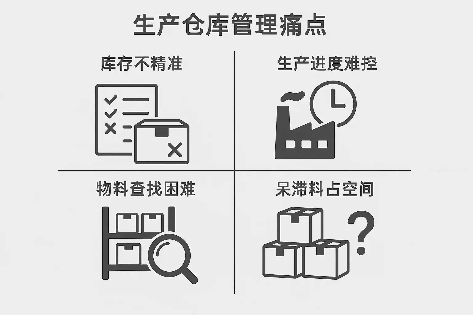 | 3 | 盘点与追溯难度大 | 盘点周期长、盘点结果易出错、产品批次追溯不清晰 |