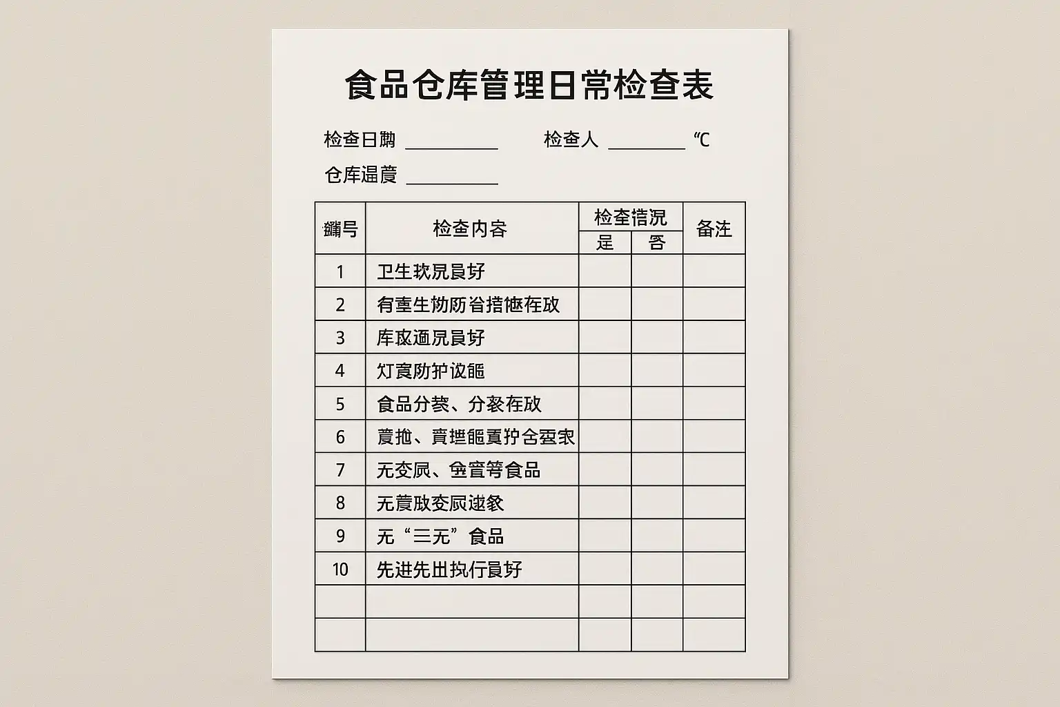 食品仓库的日常检查表应覆盖影响食品安全与仓储效率的所有关键环节。主要内容包括: