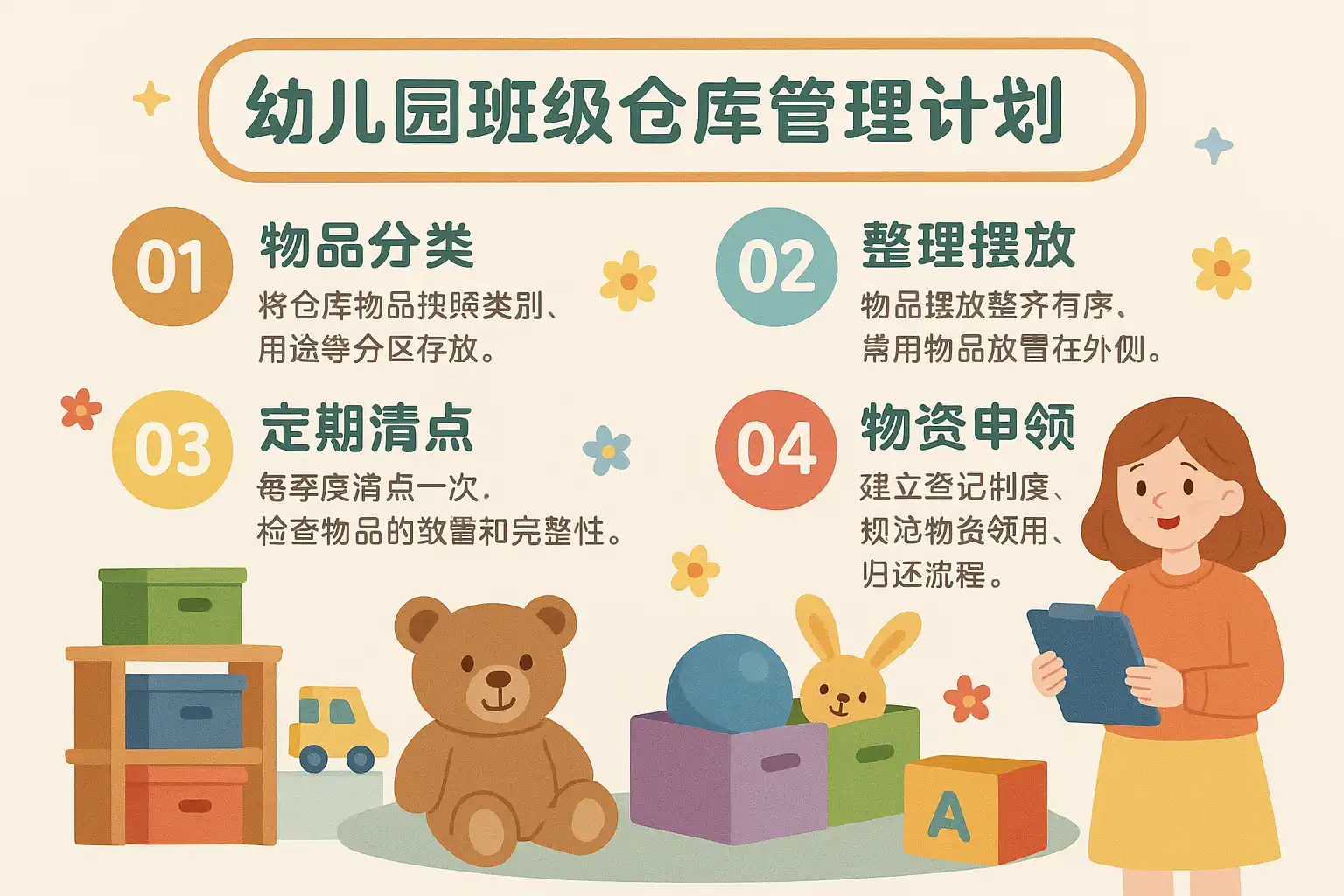 在幼儿园班级仓库管理计划中,物资的科学分类及仓库的合理布局是高效管理的基础。合理规划能让物资存取更便捷,减少时间浪费,提高使用效率。