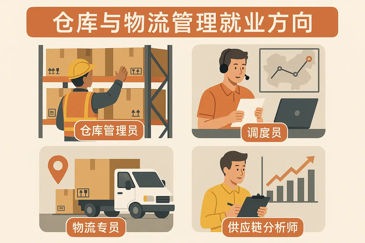 仓库与物流管理的主要就业方向包括仓库管理员、物流调度员、供应链分析师和物流项目经理等岗位。具体职责如下: