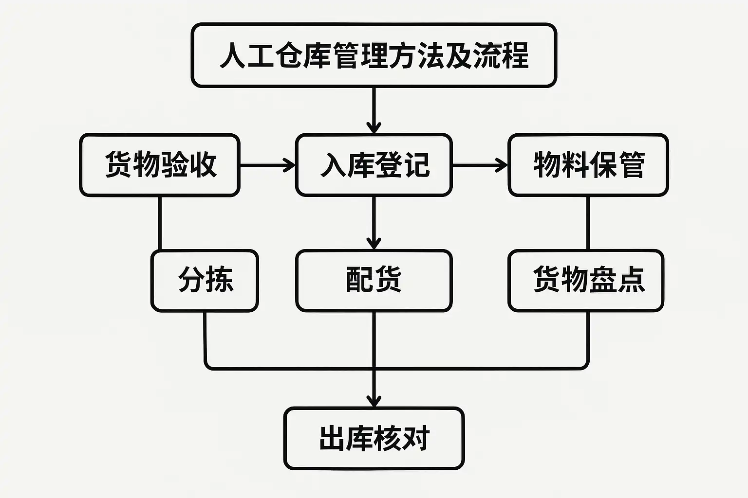 | 2 | 货品入库 | 检查、分类、登记 | 标准化验收流程,条码管理 |