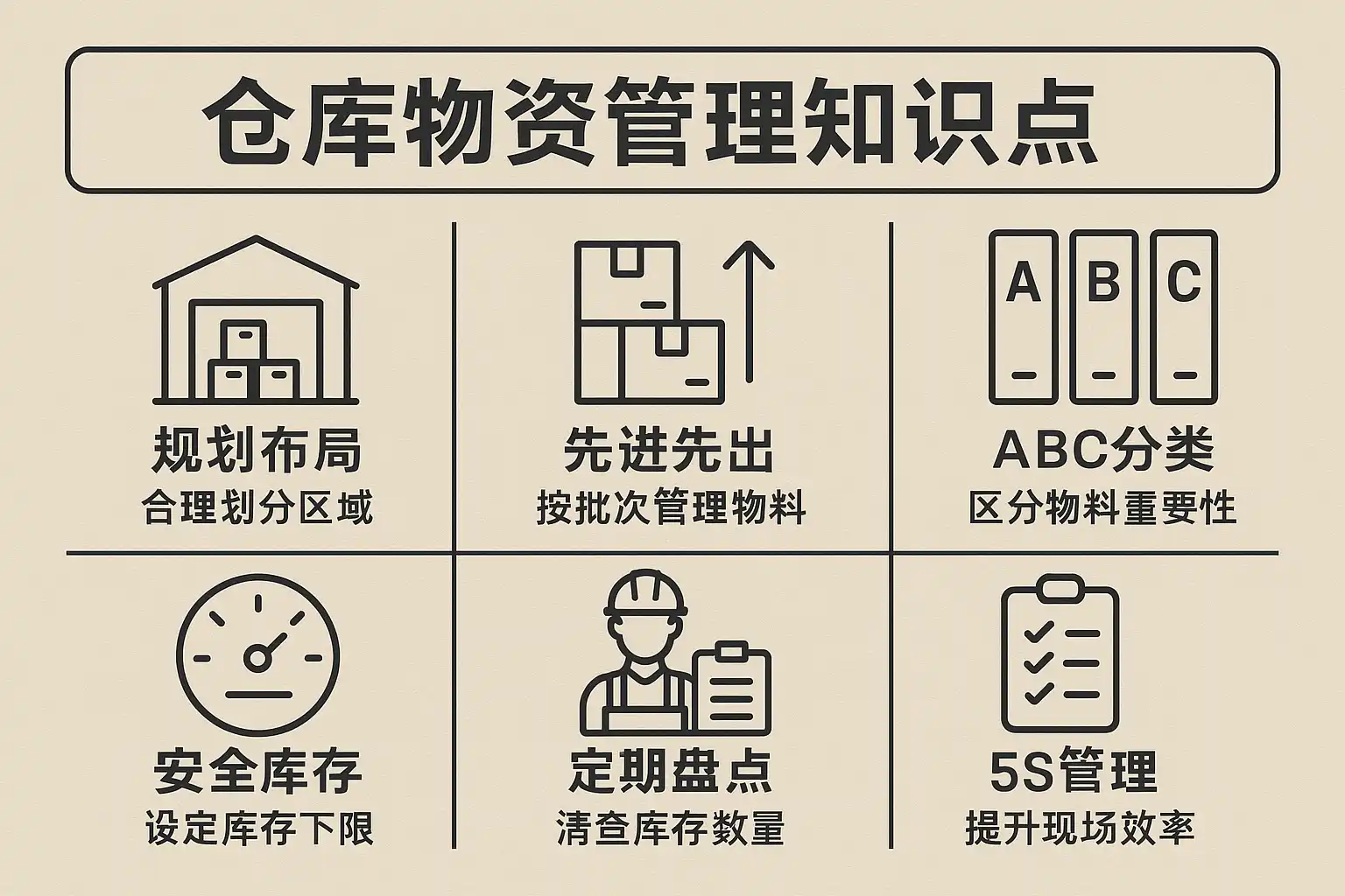 | 6 | 物资分类与编码 | 合理分类和编码便于查找和管理 |