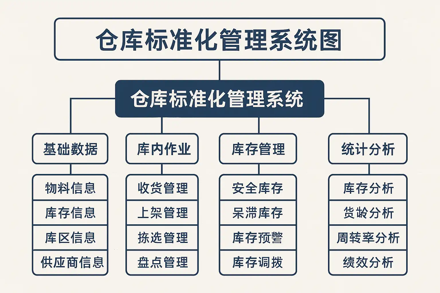 仓库标准化管理系统图,通常包括以下模块与核心流程: