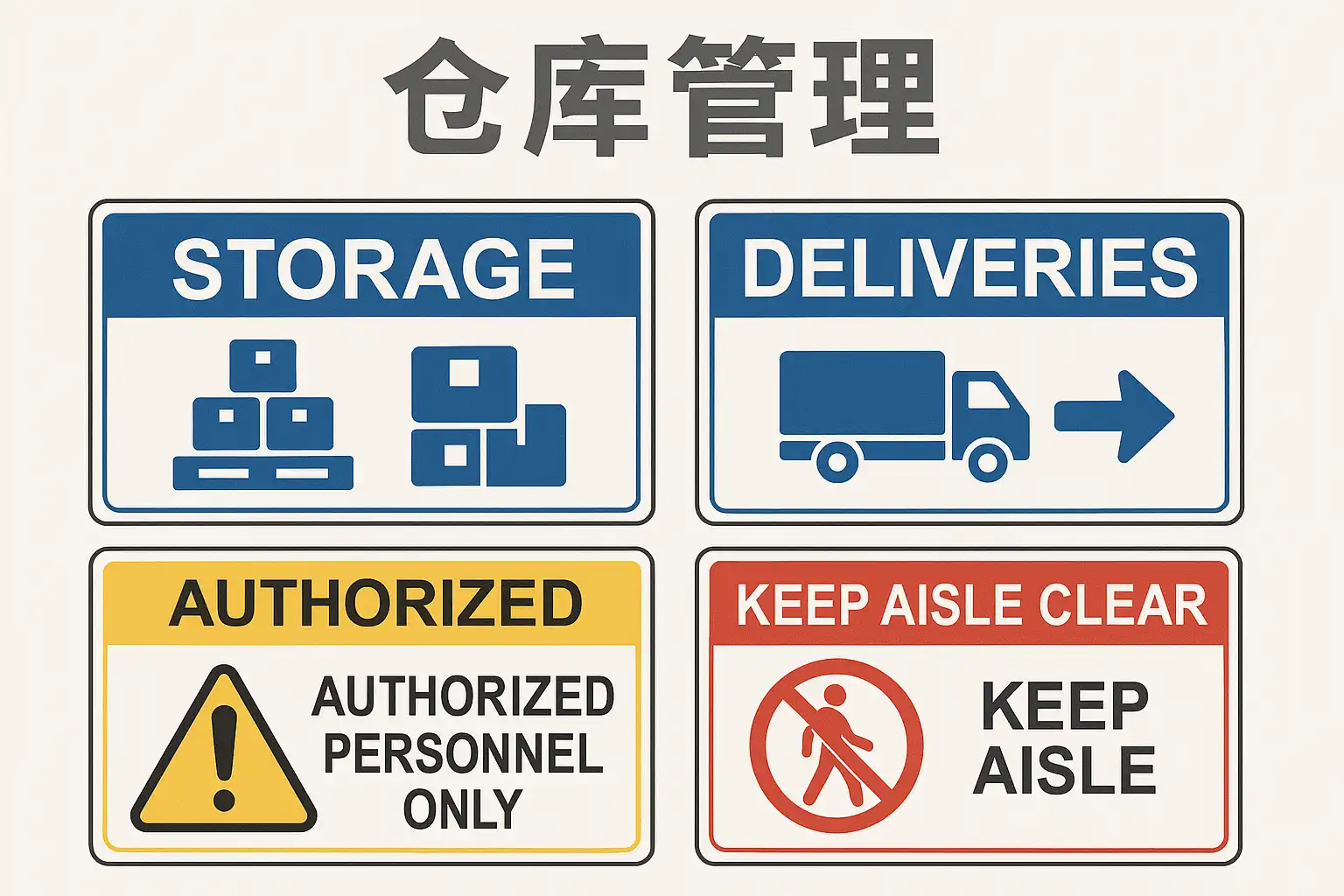 | 区域标识牌 | 划分仓库功能区,指示空间用途 | 入口、通道、区界 |