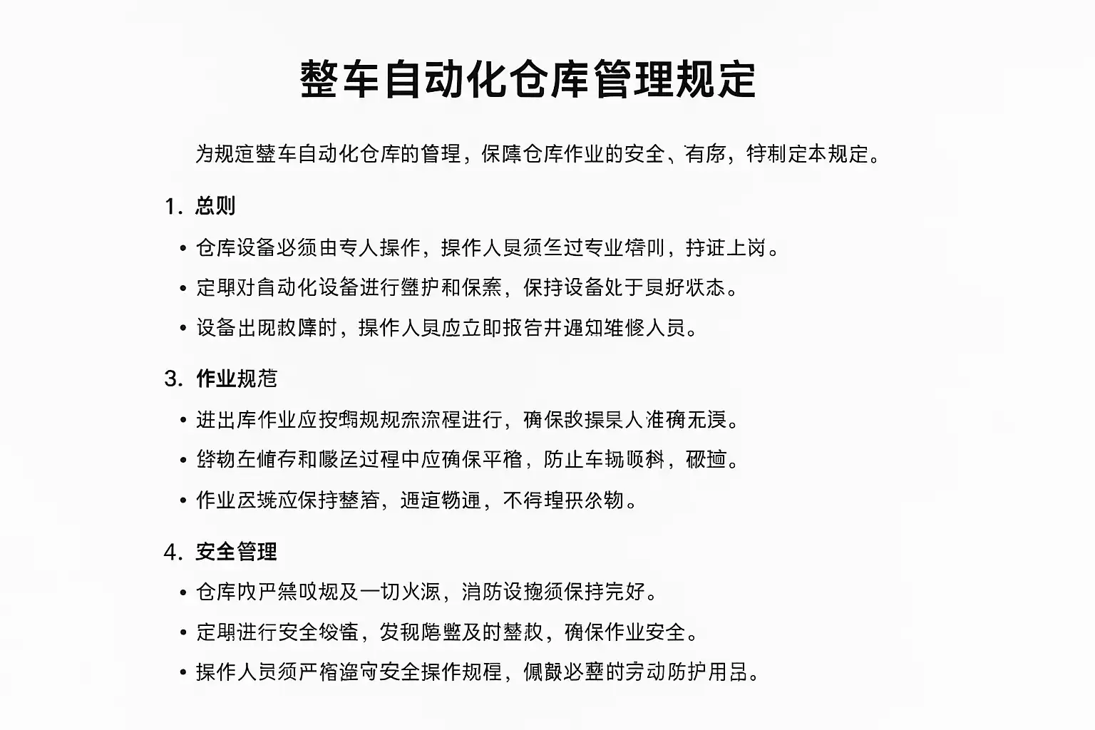 整车自动化仓库管理的规定,旨在实现标准化与高效化。主要内容包括: