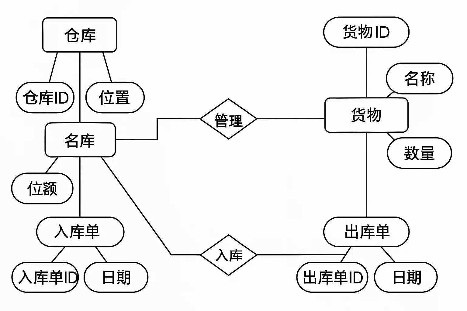 | 入库明细 | ID, 入库单ID, 货物ID, 数量, 单价 | 入库单所含货物明细 |