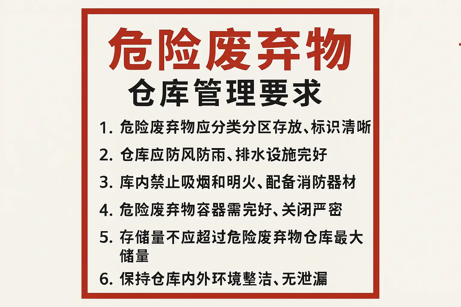 - 许可证管理:确保仓库具备合法的危险废弃物存储许可证。