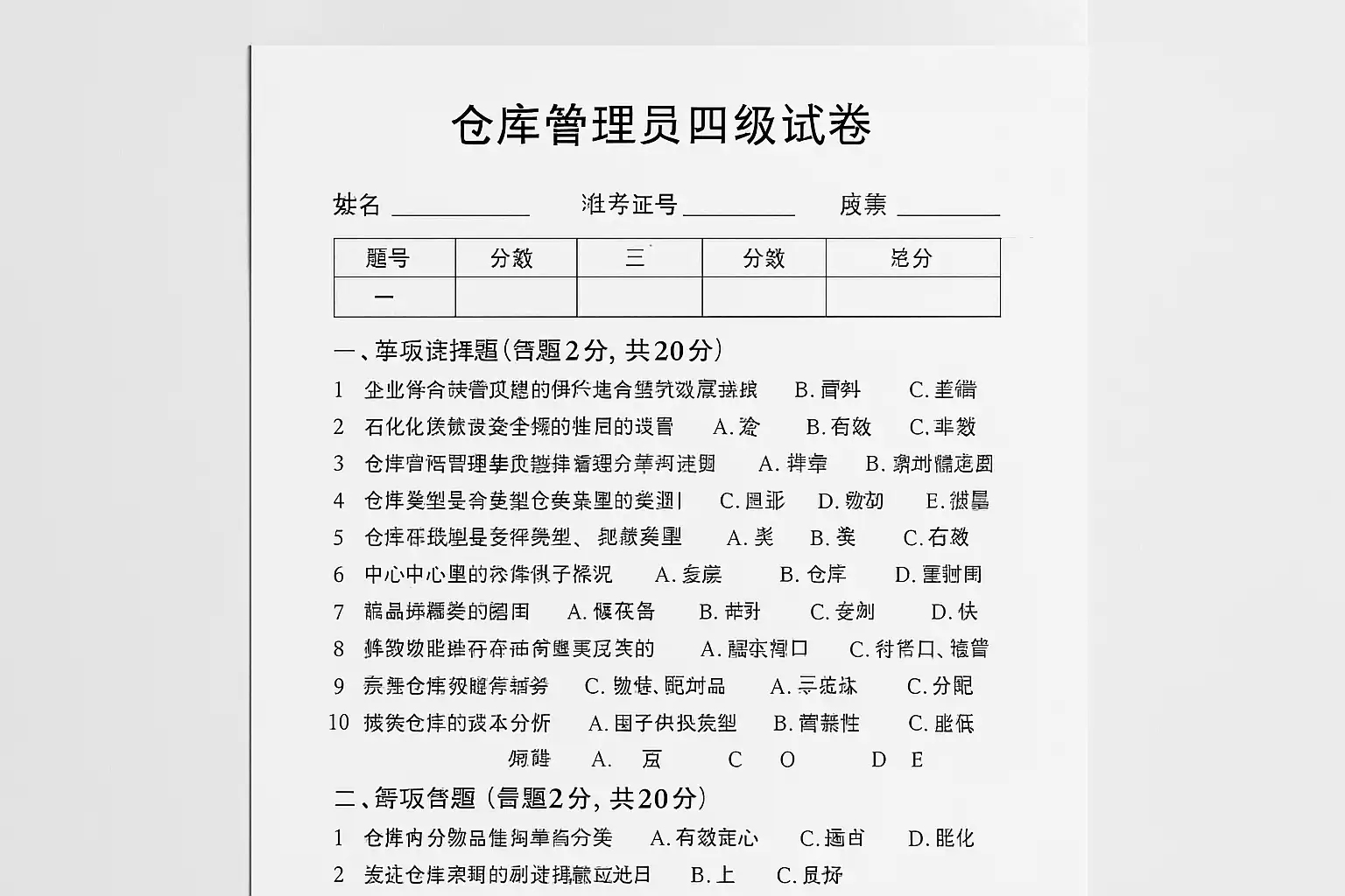 仓库管理工四级考试主要考查考生对仓库作业流程、物资管理、出入库操作、安全规范及信息化工具应用等内容的掌握。考试分为理论知识和实际操作两部分,具体结构如下: