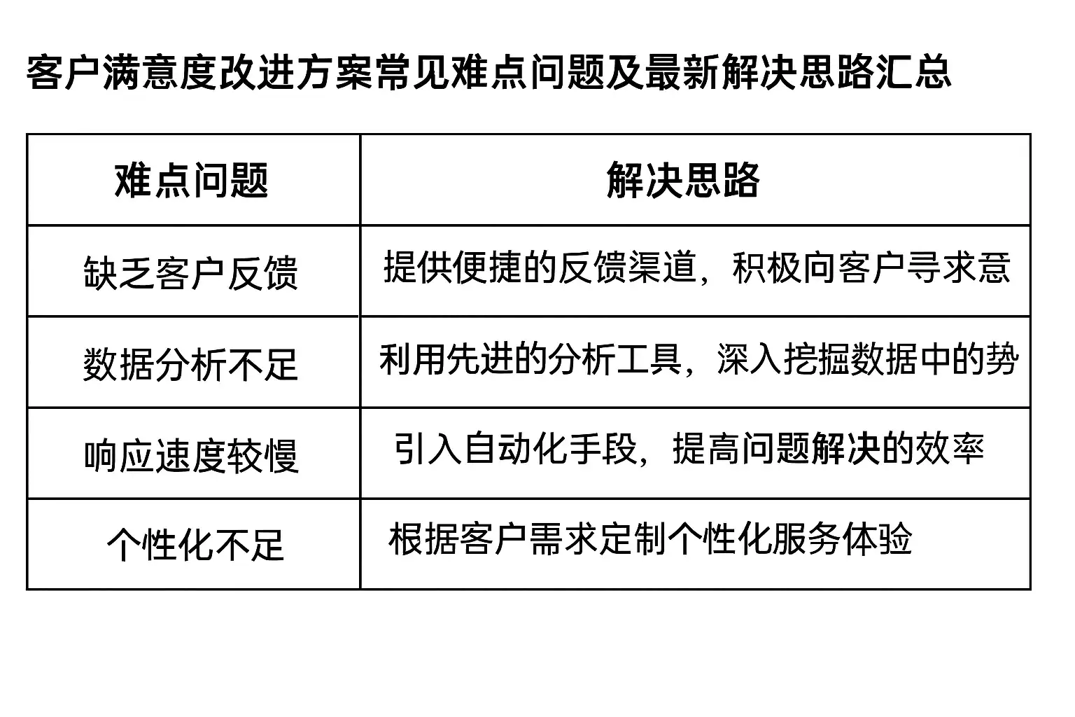 | 4 | 数据收集与分析能力不足 | 客户数据分散,缺乏有效整合与深度分析,难以发现潜在改进点 |