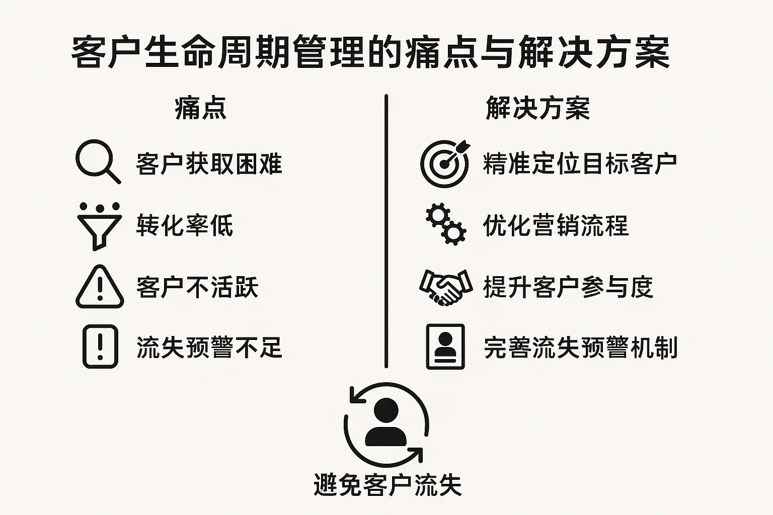 客户生命周期管理(Customer Life Cycle Management, CLCM)是企业持续跟踪、分析和优化客户从潜在客户到忠诚客户整个过程的关键环节。其痛点主要体现在以下几个方面: