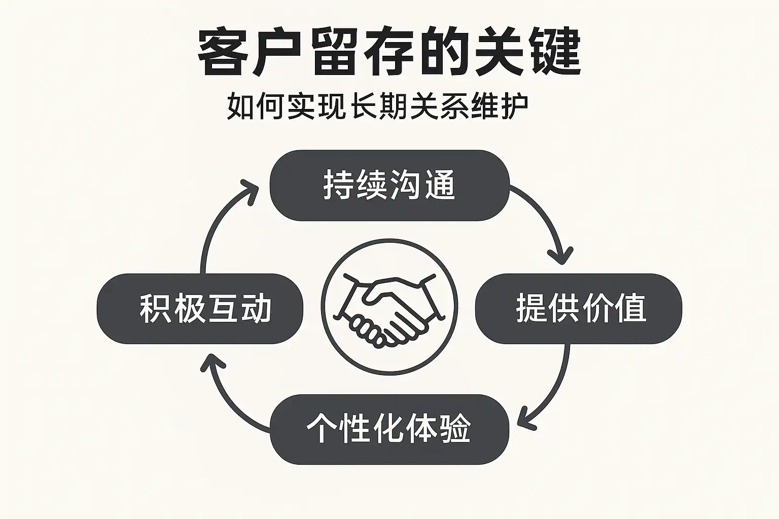 客户留存不仅仅是让客户不流失,更是在企业与客户之间建立持续、稳定、互利的关系。长期关系维护的四大核心要素如下: