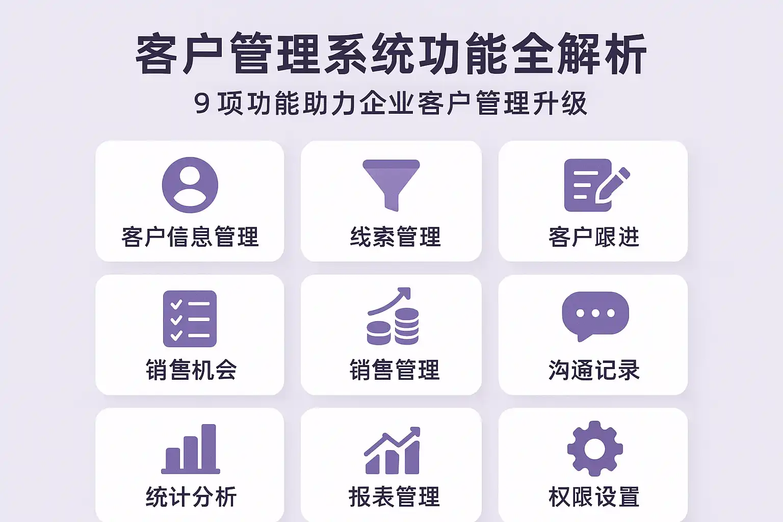 | 客户档案 | 基本信息、联系方式、行业、规模、合作历史等 | 全面掌握客户画像 |