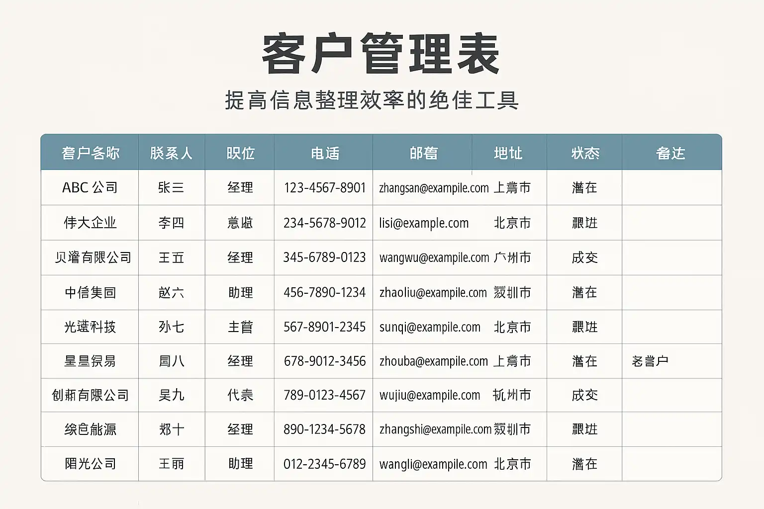 | 基础客户信息表 | 客户档案管理 | 姓名、电话、邮箱、公司、职位 | 适用面广,信息结构清晰 |