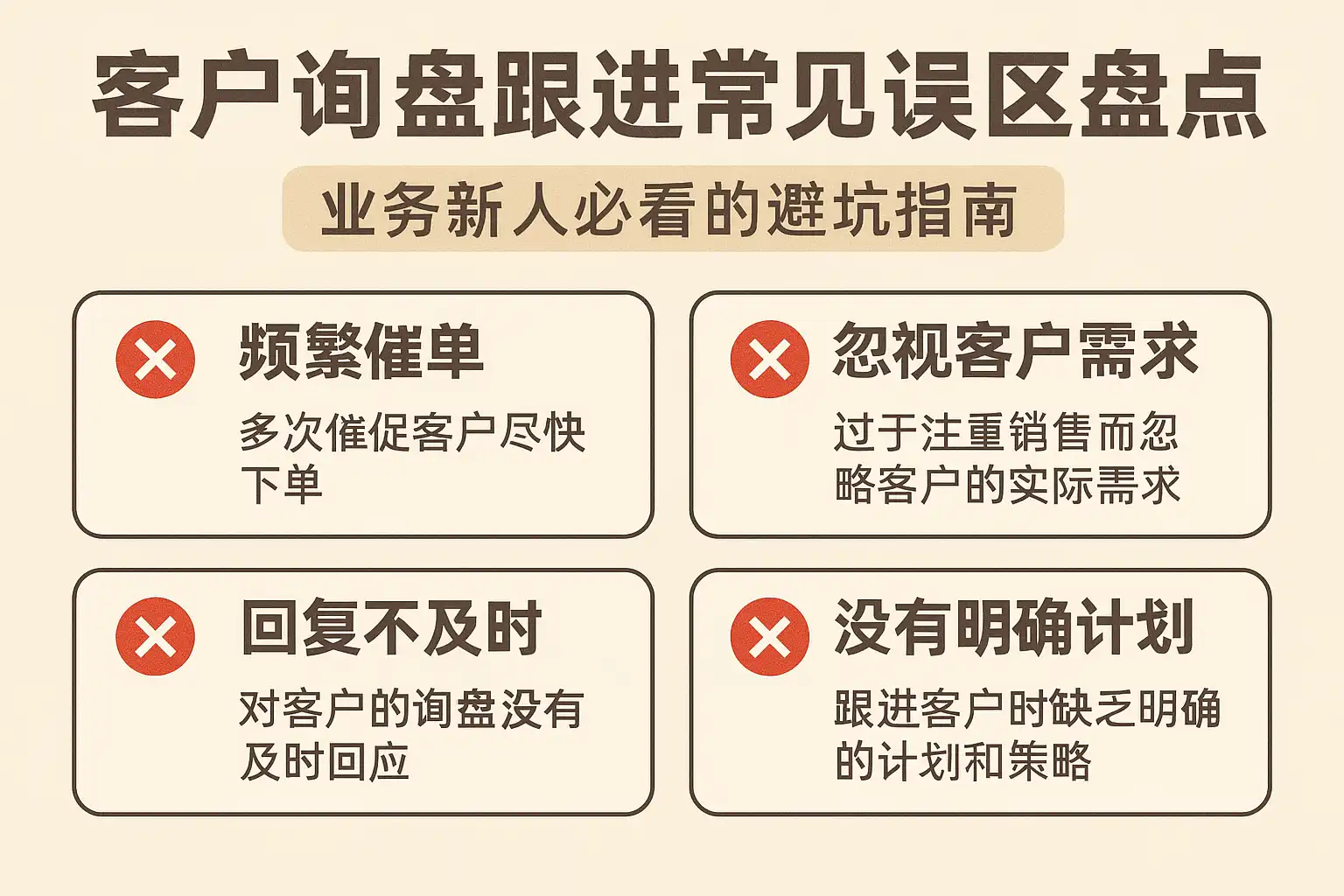 客户询盘是业务流程中的关键环节,跟进质量直接决定成交概率。以下为业务新人最常出现的主要误区: