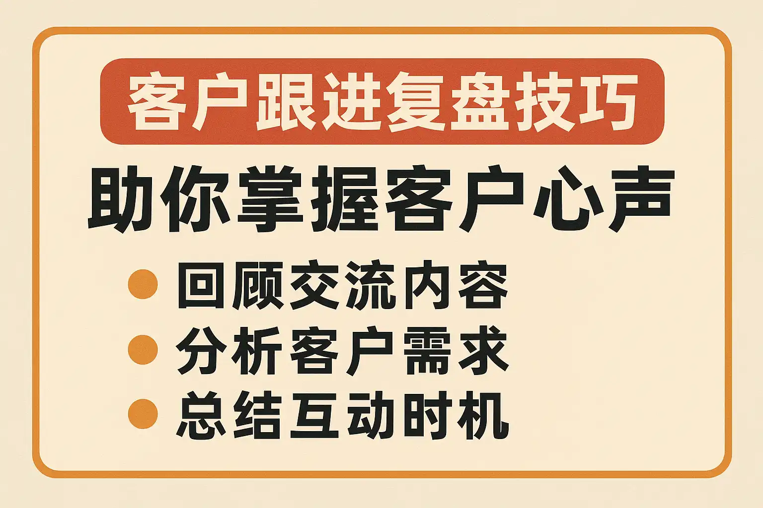 - 建立客户档案,定期复盘客户需求变化。