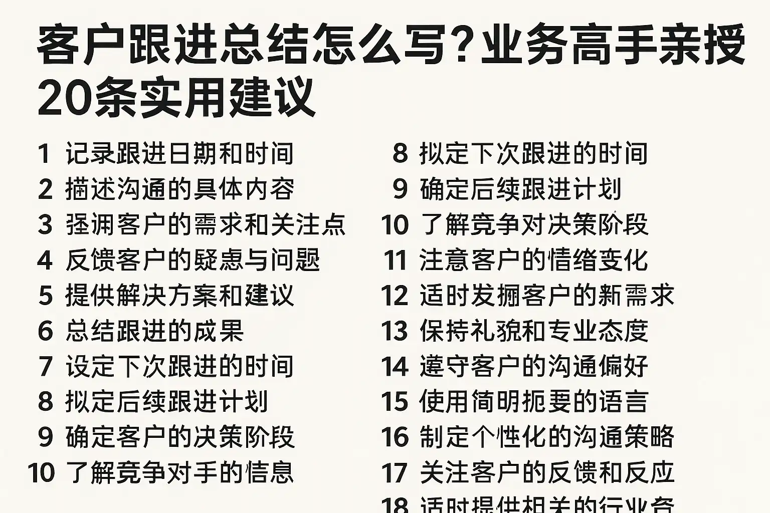 以下20条建议,是业务高手多年实战经验的凝练,助你高效提升跟进质量。