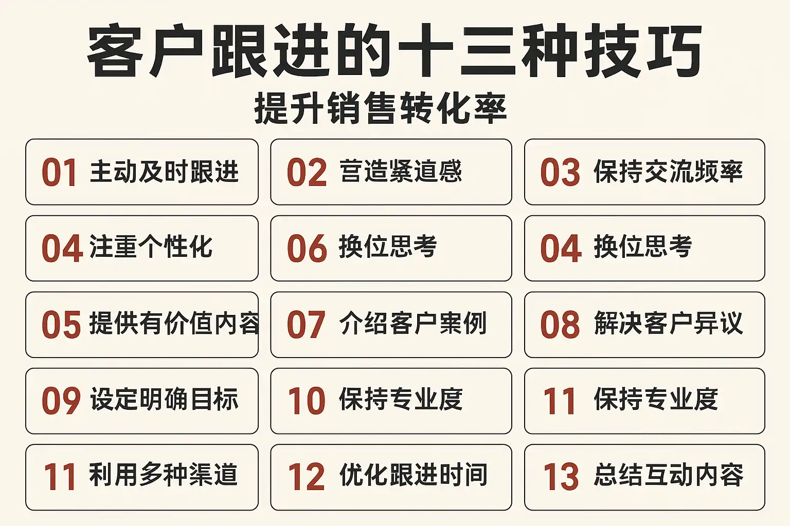 - 持续沟通:定期互动,主动提供有价值的信息。