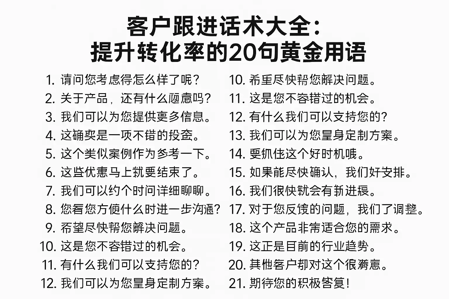 我听说有一套‘20句黄金用语’可以提升销售成功率,但具体内容不清楚。能否介绍这20句关键客户跟进话术用语,帮助我在销售中更高效?