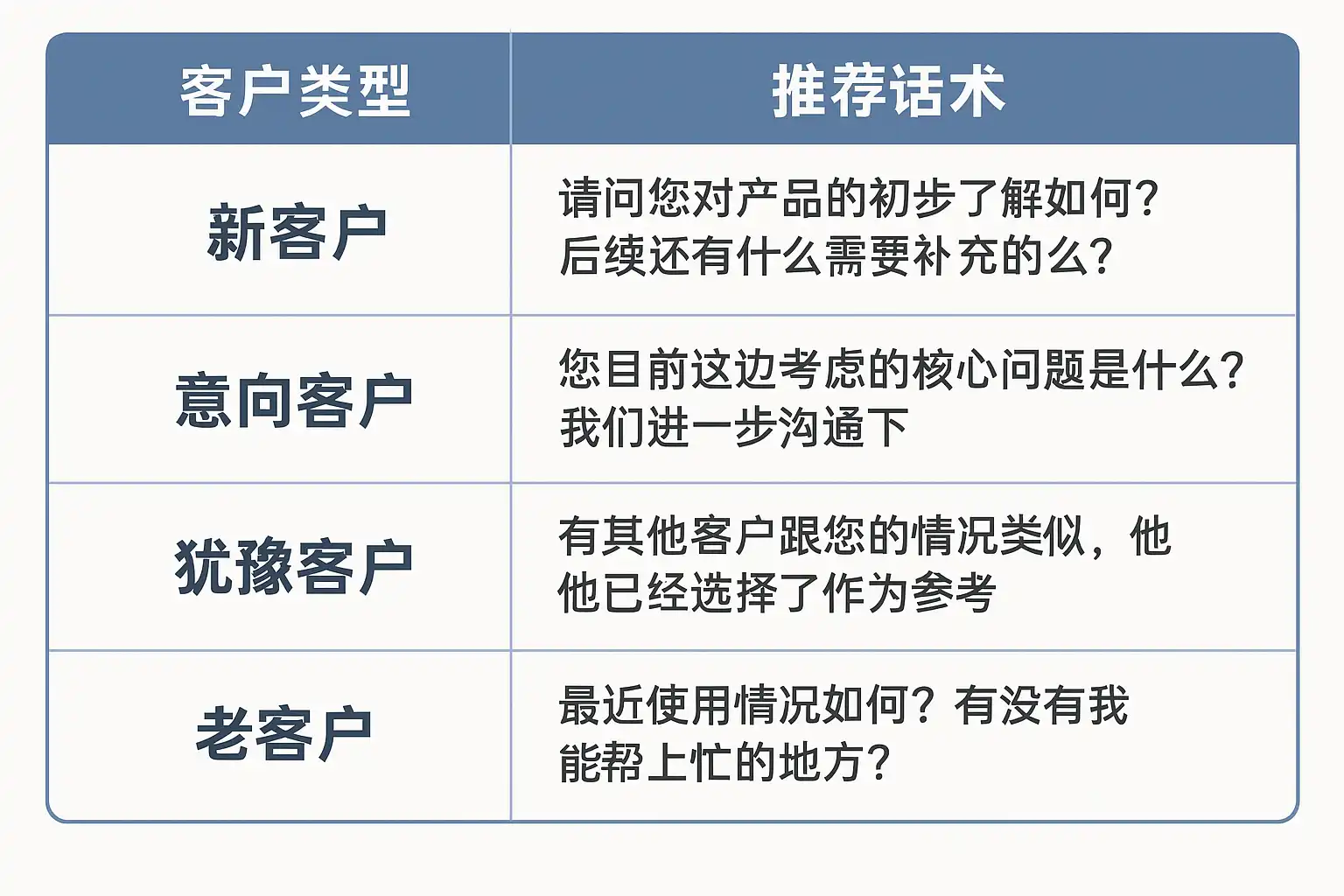 - 老客户:注重关系维护和二次销售,适合采用感谢反馈及个性化推荐的话术。