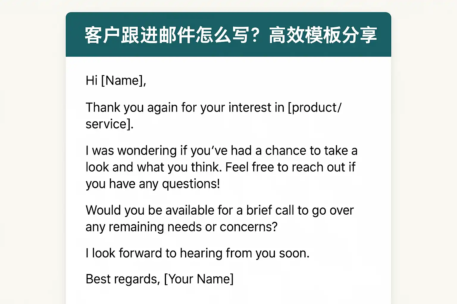- 邮件结尾加一句“如需帮助,欢迎随时联系”,拉近客户距离。