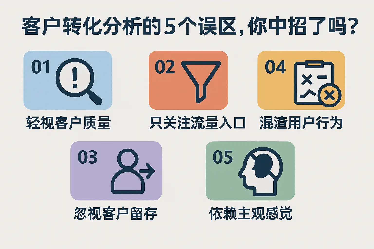 客户转化分析作为企业增长和营销优化的核心环节,若操作不当,极易陷入认知和方法上的误区。以下列举了最常见的五个误区,并对每个误区进行简要说明: