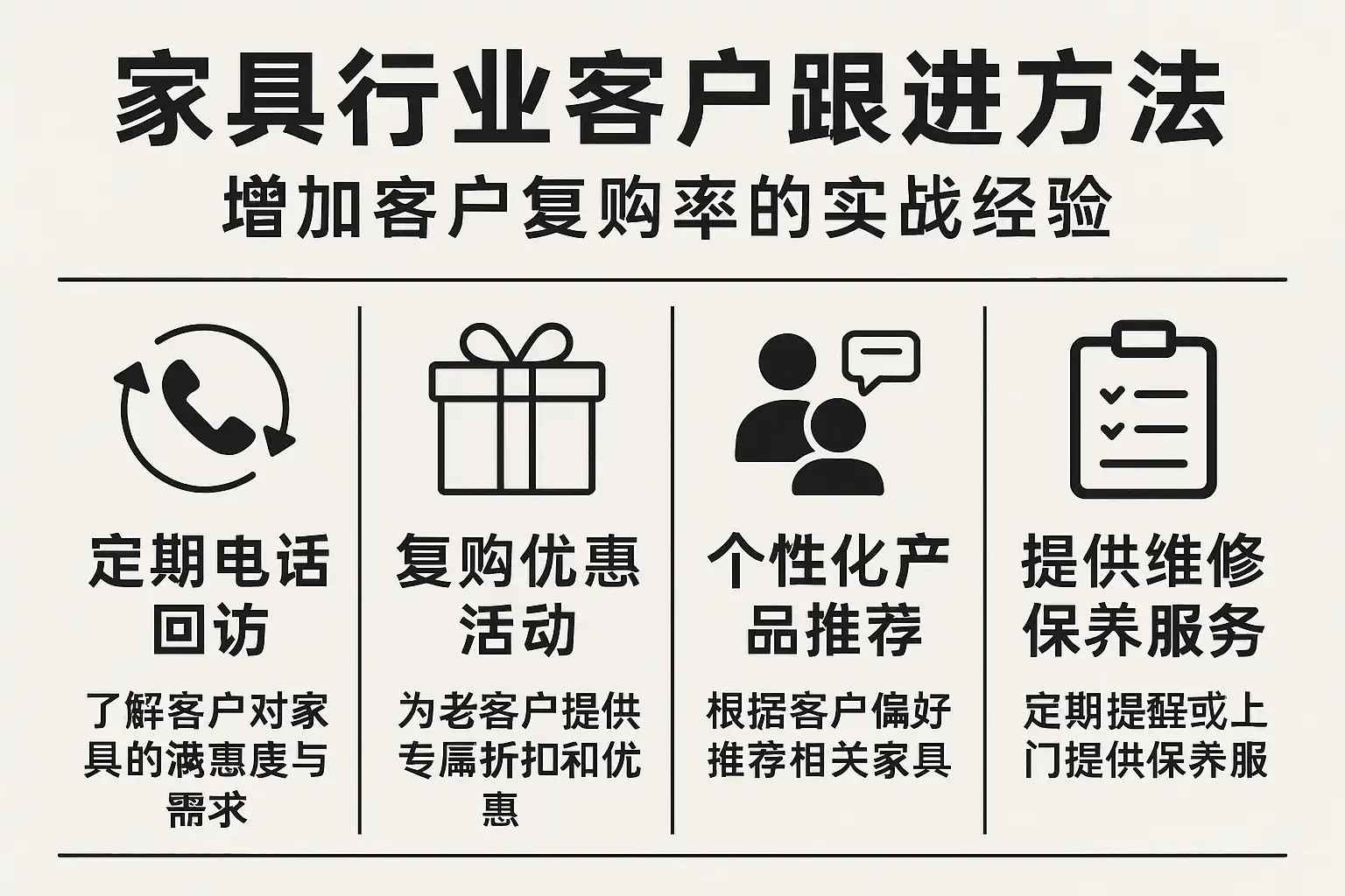 在家具行业,提升客户复购率的有效客户跟进方法包括: