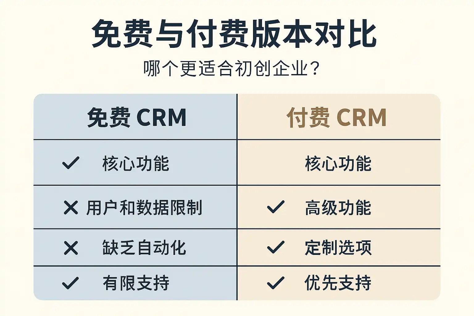 在选择CRM系统时,初创企业最关心的通常是成本、功能和扩展性。下表对免费CRM与付费CRM的核心特性进行了对比: