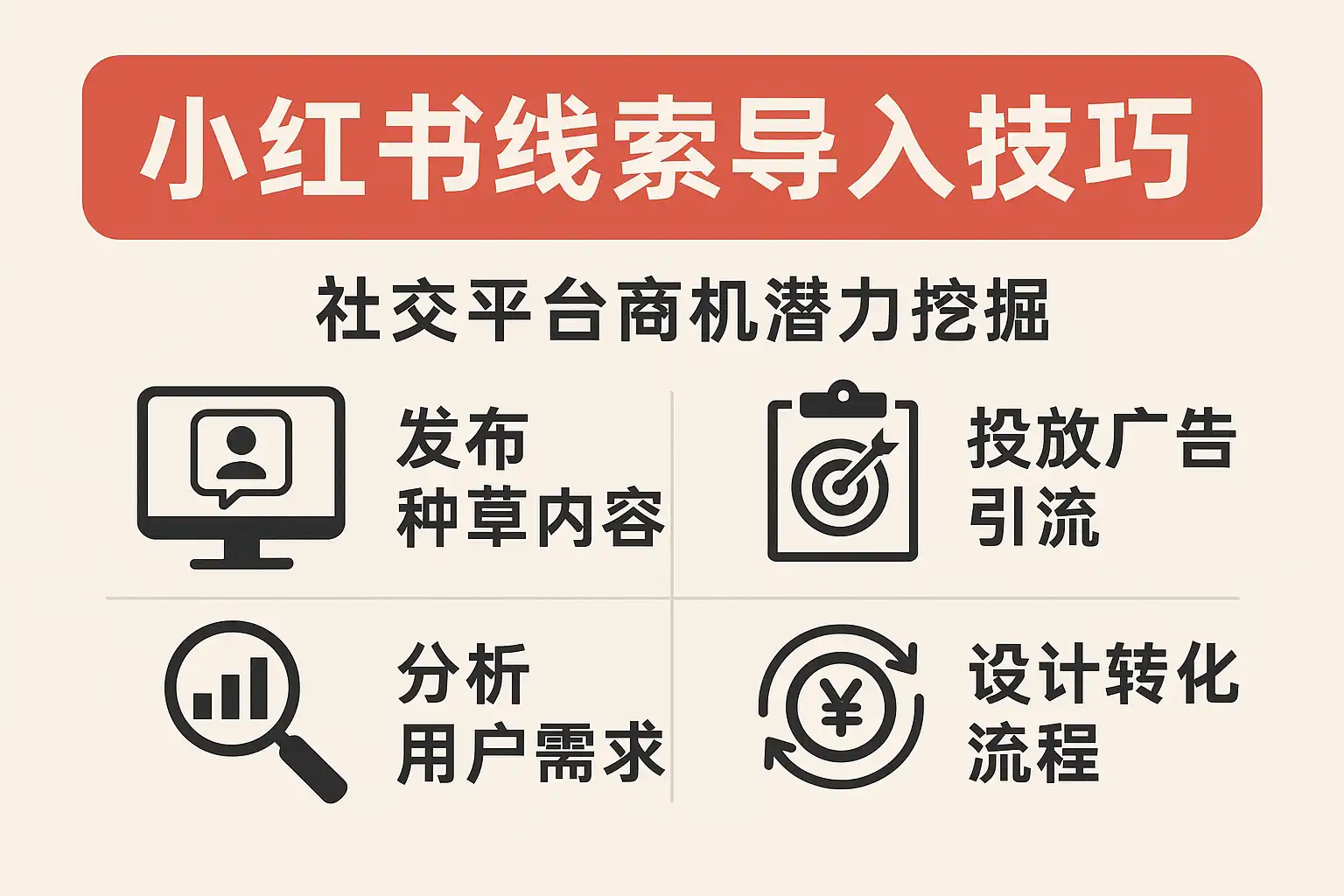 | 社群搭建 | 建立微信群、QQ群或小红书群聊,集中高潜用户,定期推送福利、干货内容 |