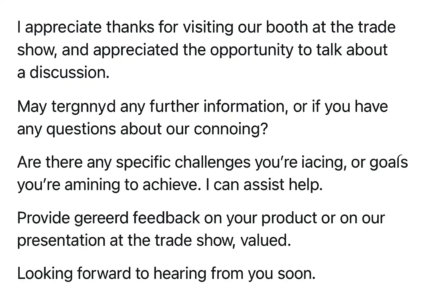 此外,避免使用过于强硬或推销的表达,如“Buy now”或“Urgent”,以免引起反感。示例表达: “Thank you for your time at the exhibition. I would like to offer a customized solution to address your challenges and look forward to your response.”