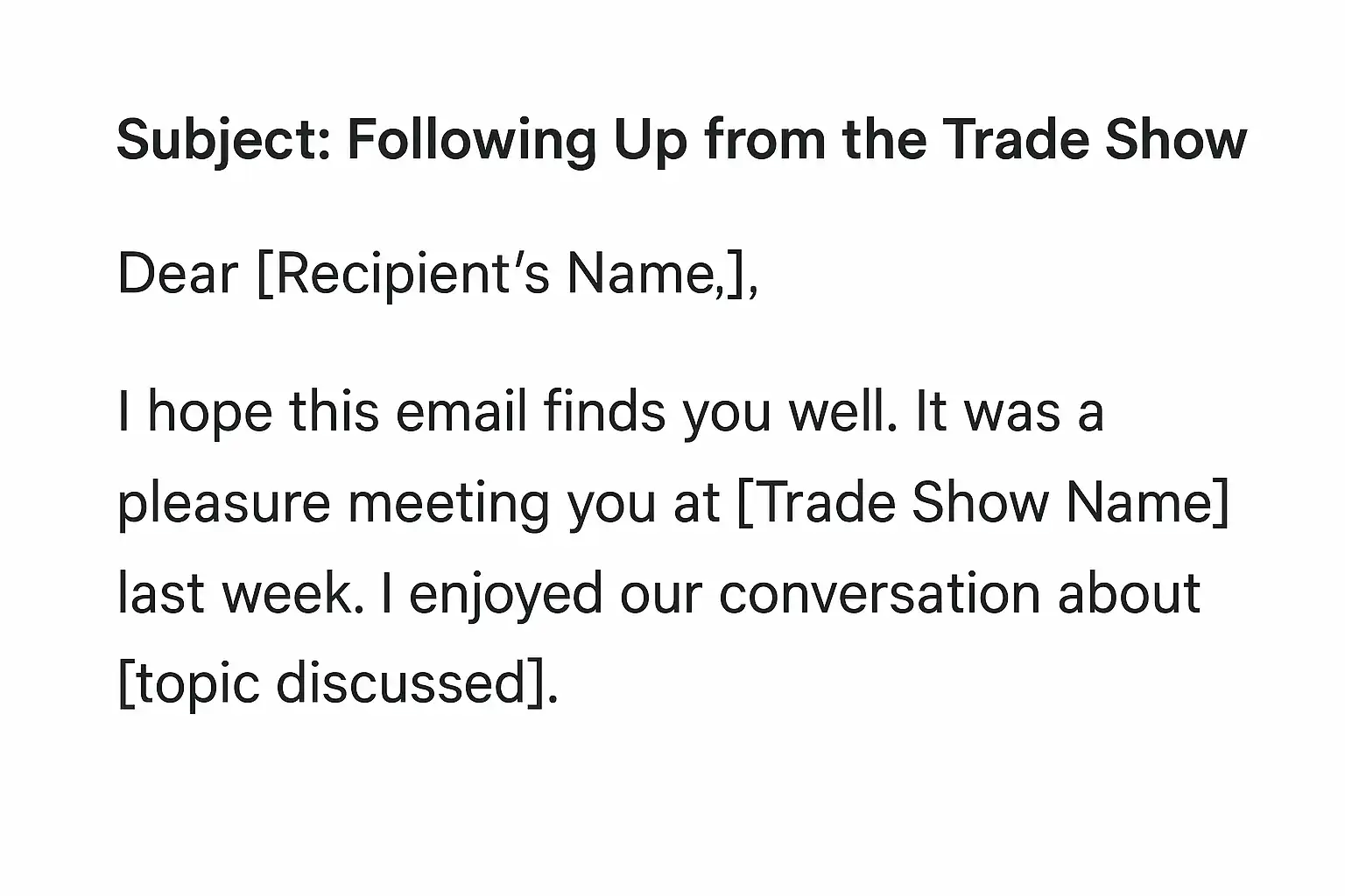在[展会名称]期间,很高兴与您探讨了[具体话题/产品]。 针对您关注的[需求点],我们已准备了详细的解决方案(见附件),欢迎进一步交流。 如需详细资料或安排电话会议,请直接回复本邮件或致电[电话]。