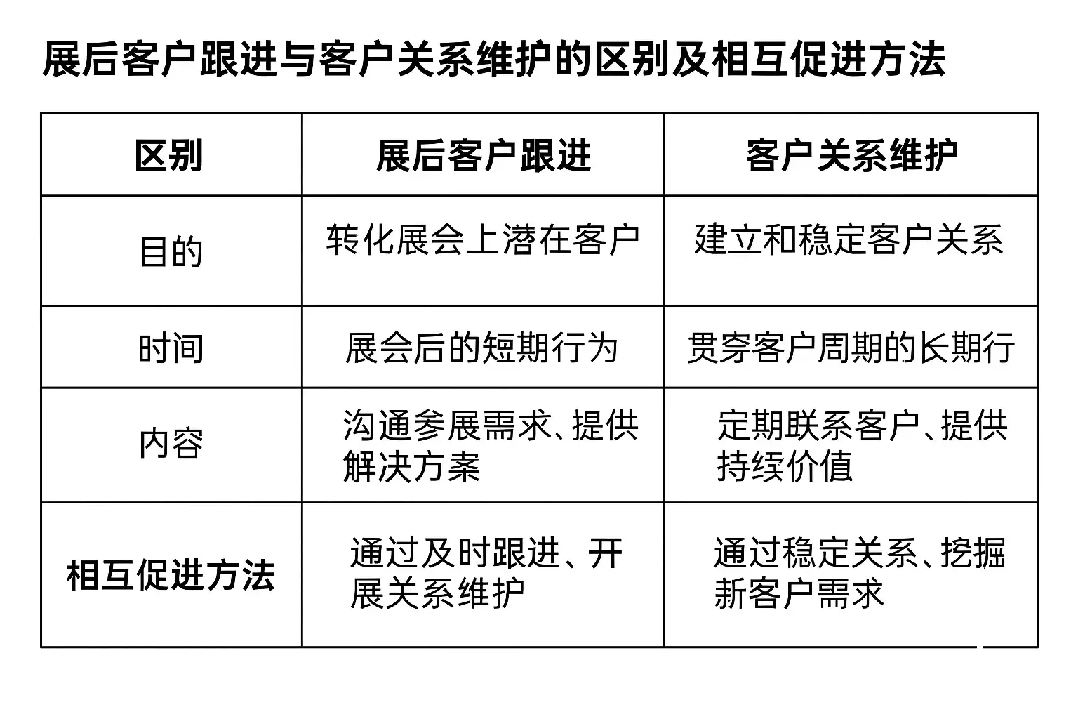 | 区别维度 | 展后客户跟进 | 客户关系维护 |