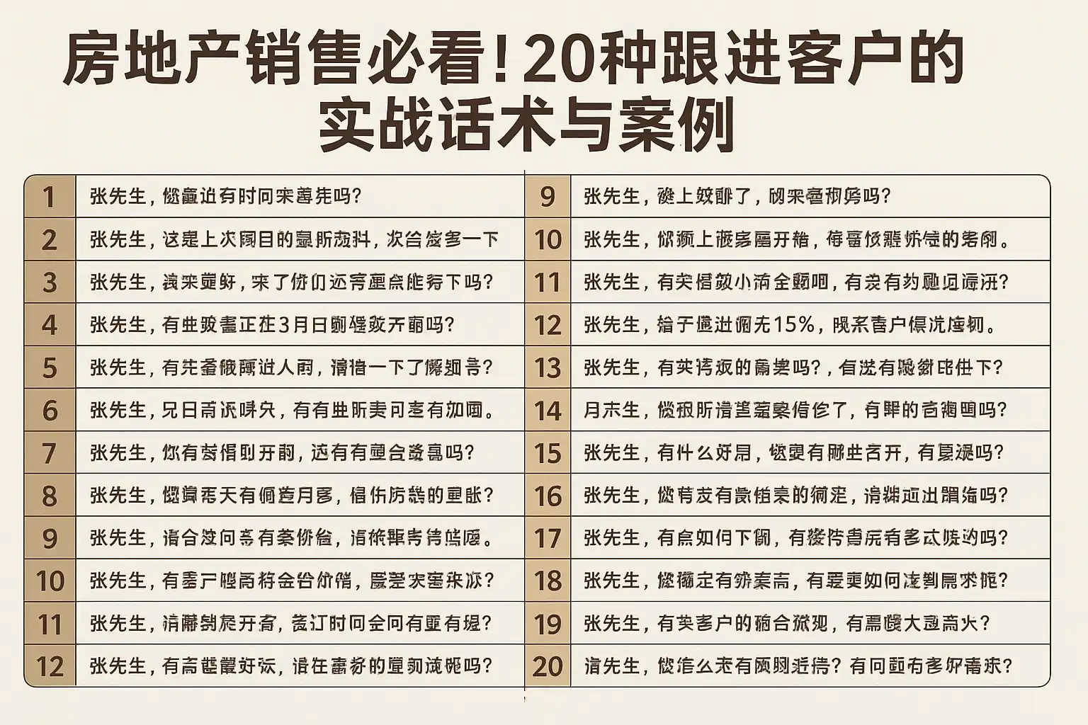 房地产销售实战话术技巧中,20种跟进客户案例具体包含哪些类型?