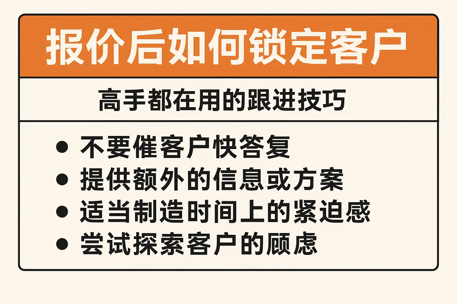 报价后,客户往往会犹豫或拖延决策。此时,主动且有节奏的跟进,是高手锁定客户的关键。具体包括: