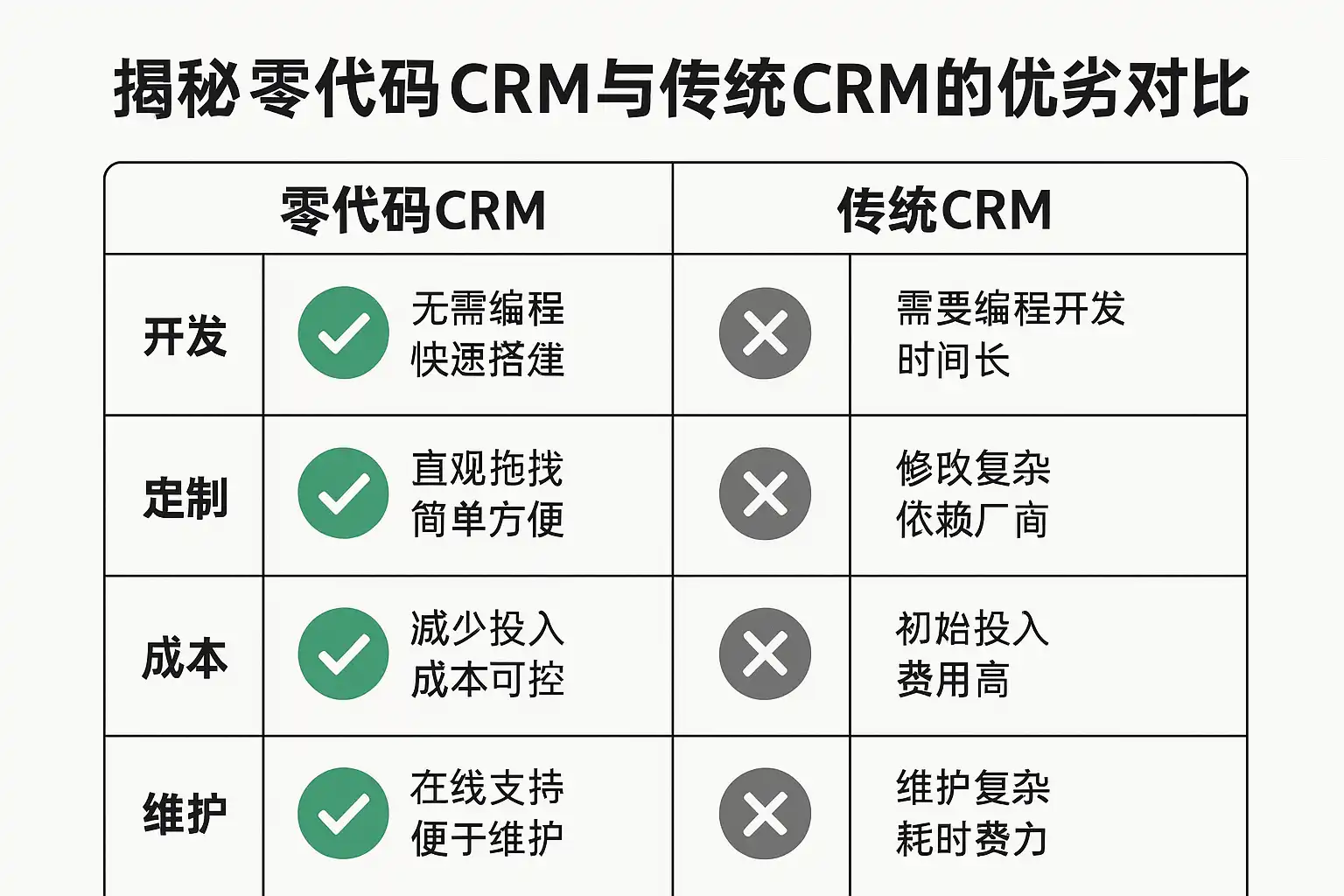 | 维度 | 零代码CRM | 传统CRM |