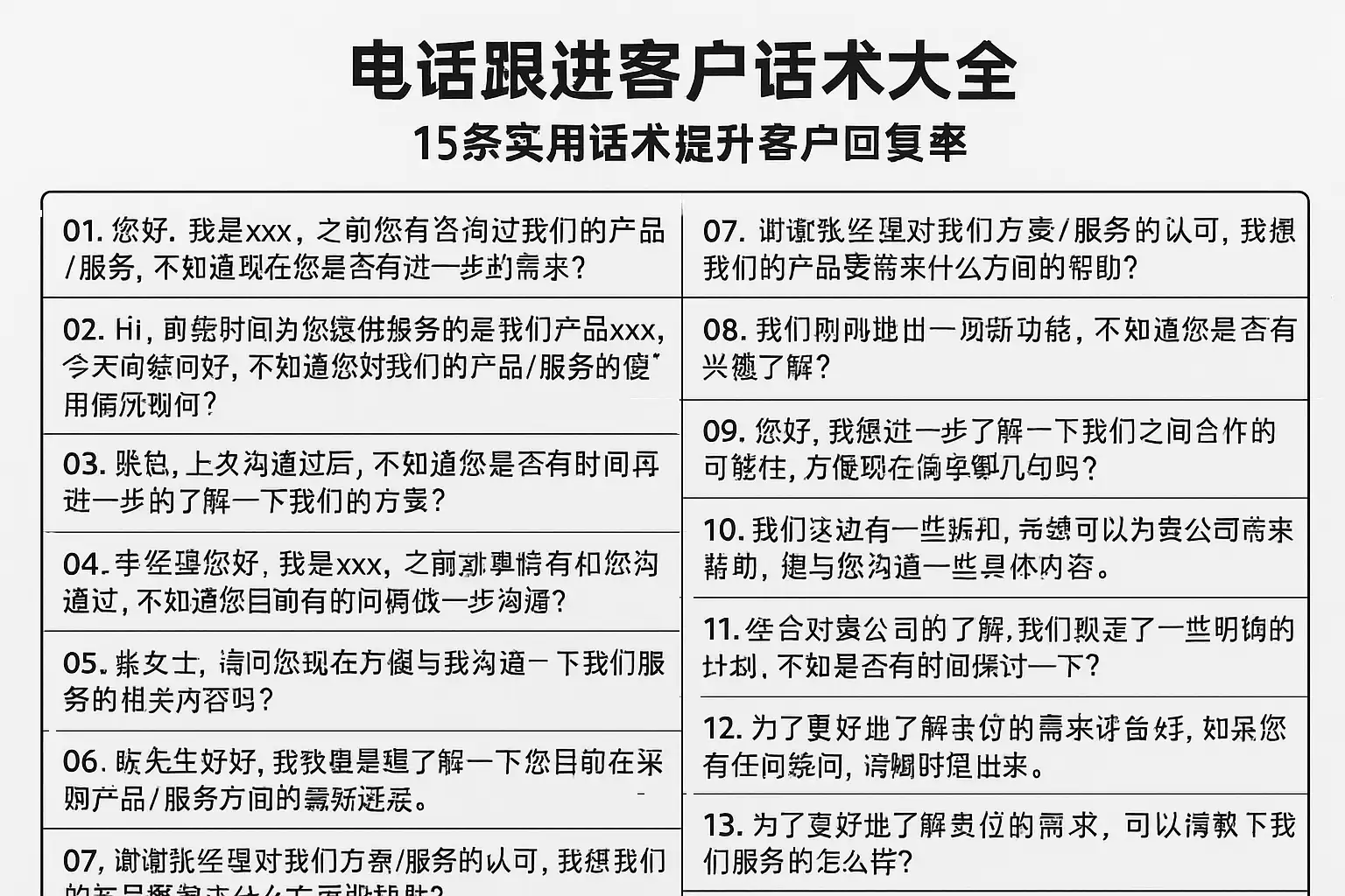 | 开场 | 介绍身份、说明目的 | “我是XX公司的XX,致电是关于您上次咨询的……” |