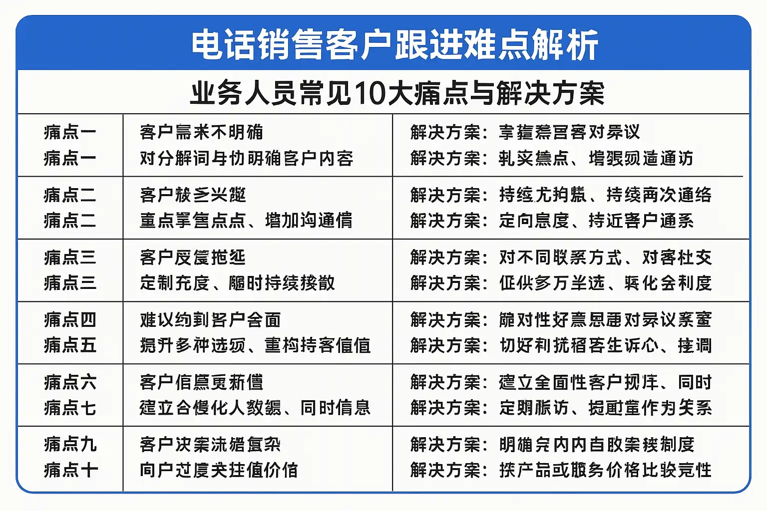 电话销售场景中,业务人员面临诸多挑战。以下表格汇总了10大常见痛点,并对症解析其成因: