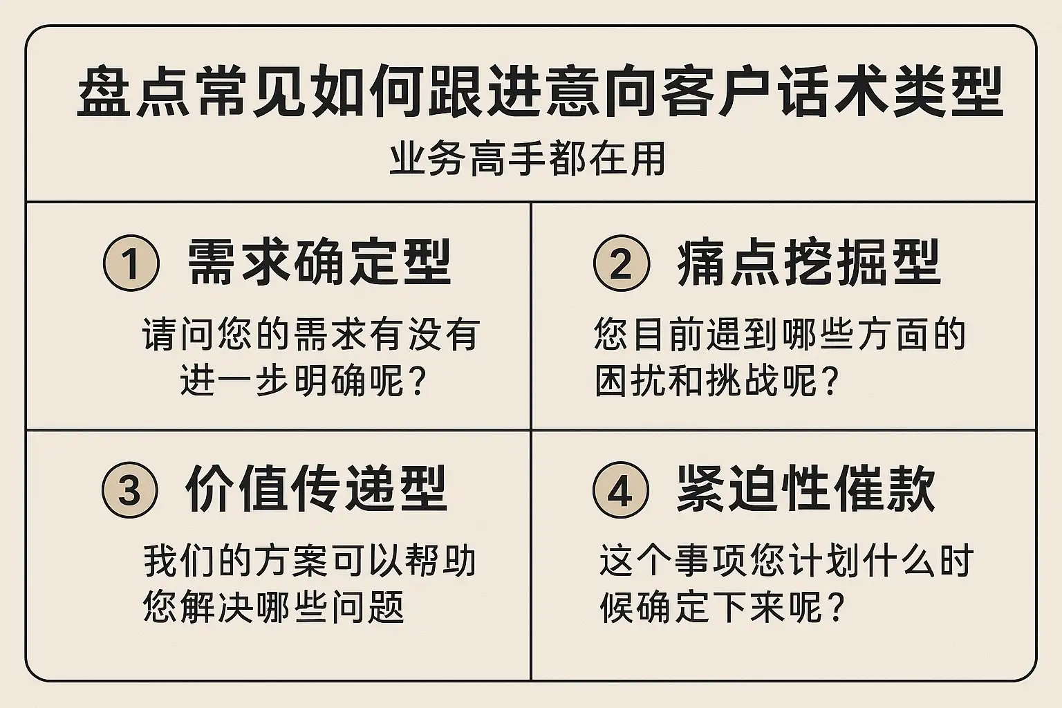- 精准提问:开放式(为什么/如何)用于探索,封闭式(是否/是否接受)用于推进,分层提问避免“连珠炮”。