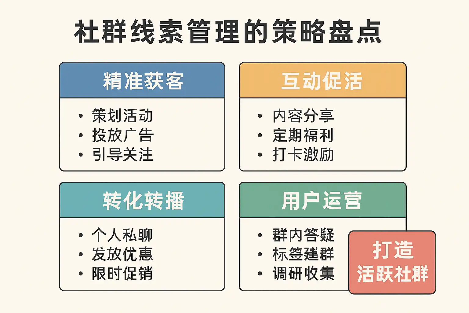 - 社群生命周期:拉新 → 入群 → 激活 → 养熟 → 转化 → 复购 → 裂变