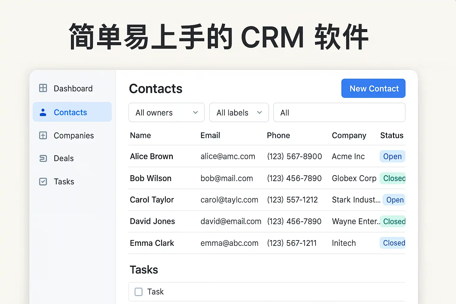 - HubSpot CRM:免费基础版,界面友好,功能涵盖联系人管理、销售管道和报告分析,适合初学者。