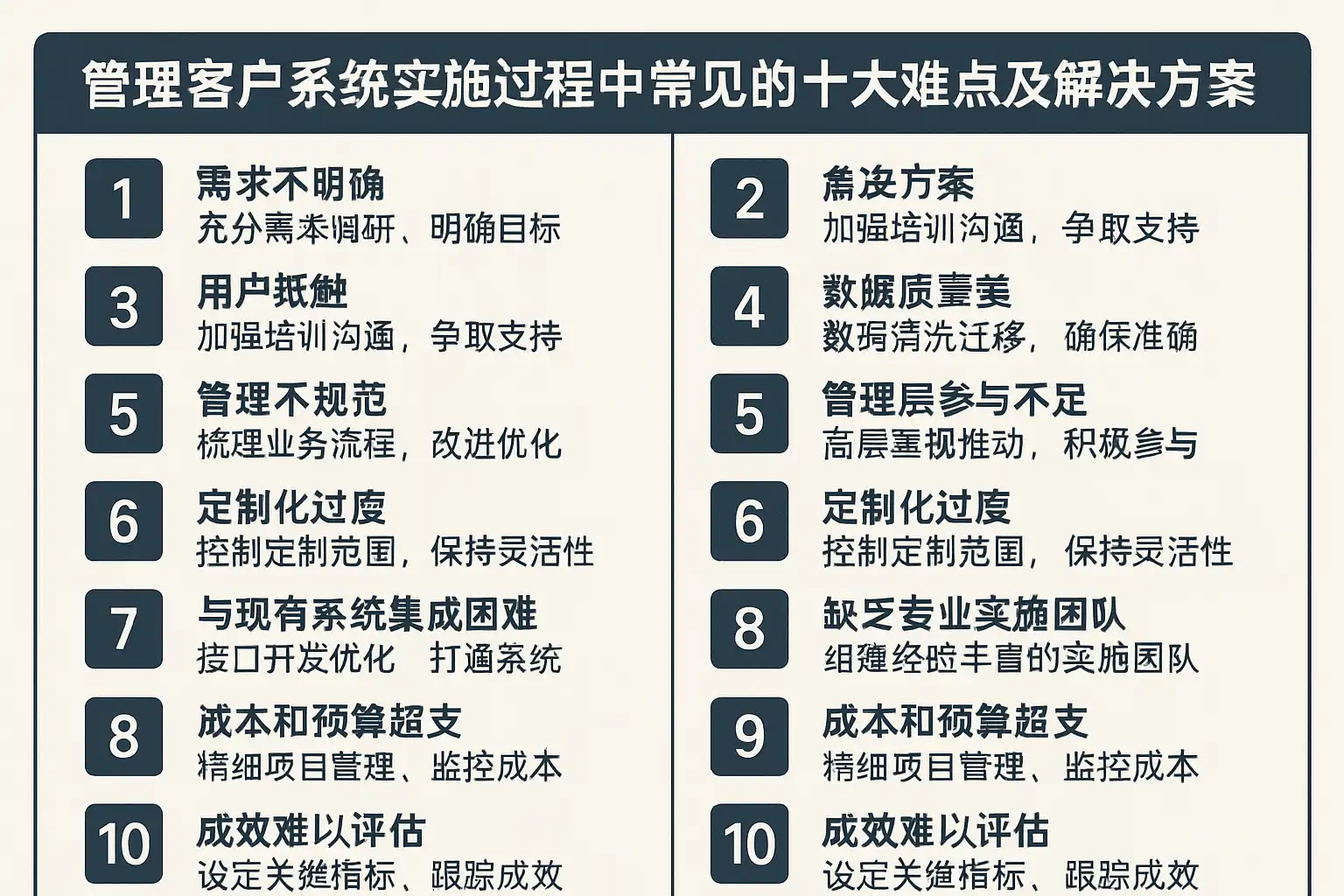| 数据脏乱 | 多表孤岛、历史字段不一致 | 建立客户主数据模型与唯一键,先清洗后迁移,分批上线 |