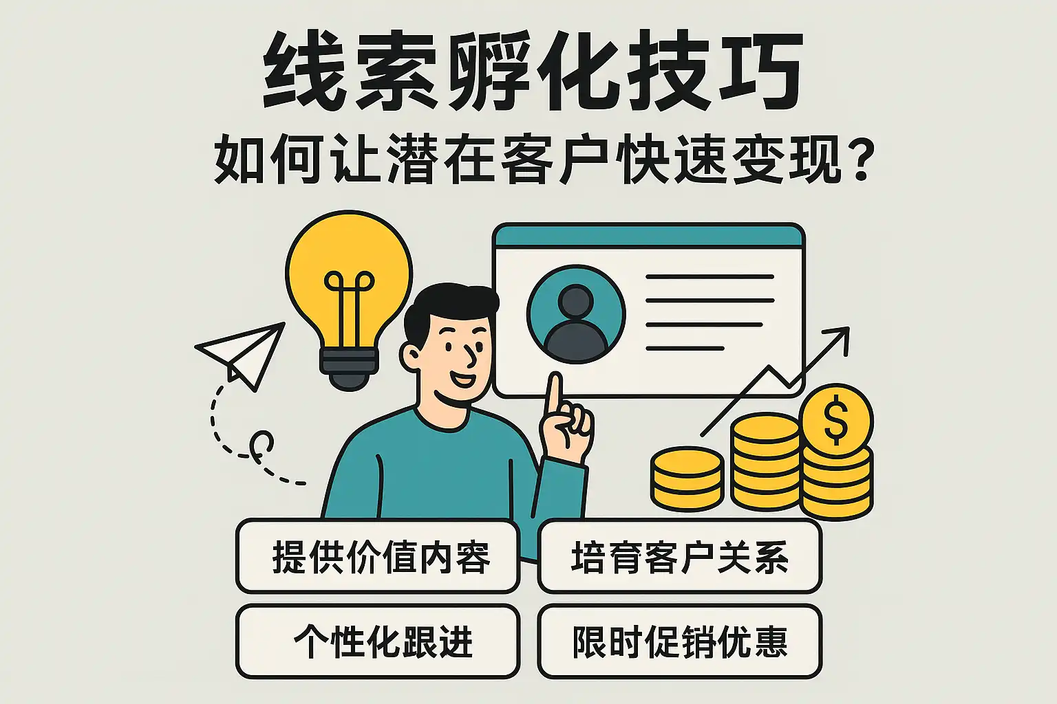 线索孵化技巧主要包括精准分类、个性化沟通、多渠道触达和价值内容输出四大步骤。具体做法如下: