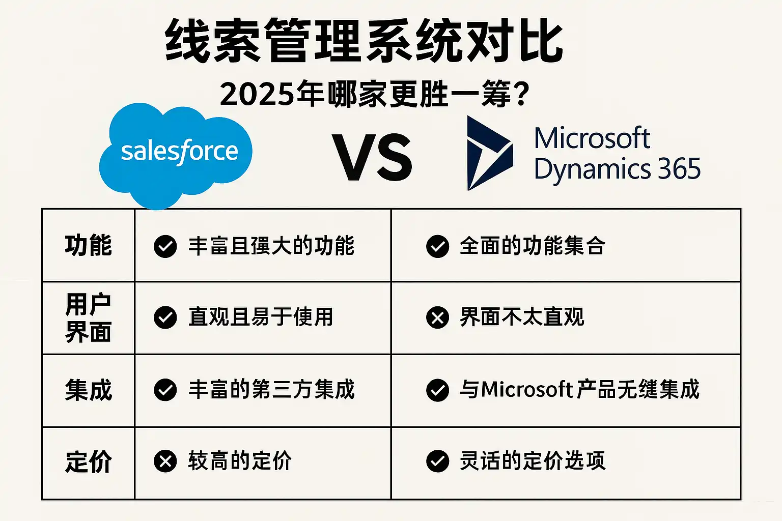 - 推荐:Salesforce(核心)、与企业内部中台/数据仓结合;亦可混用HubSpot做营销前端